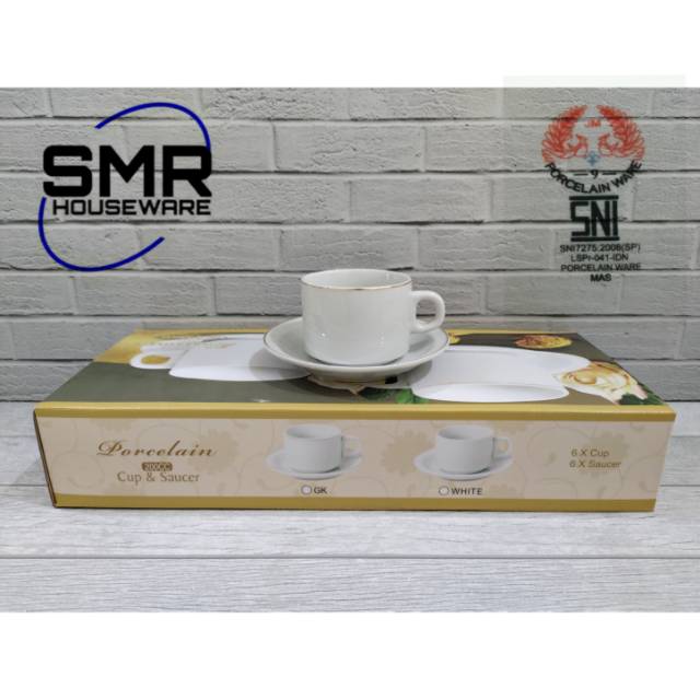 CANGKIR KERAMIK SET PUTIH LIST EMAS MERK JM UKURAN 200CC . Sumber Gambar : shopee.co.id
